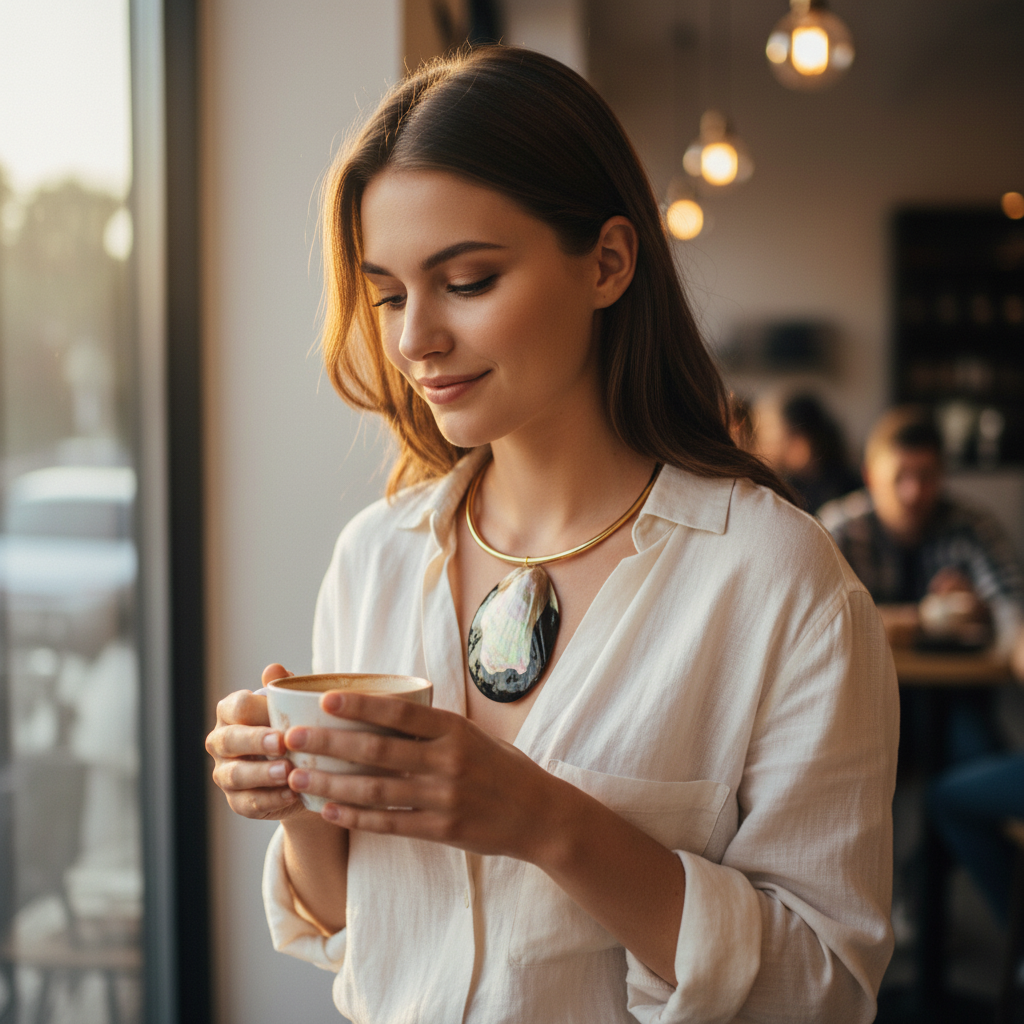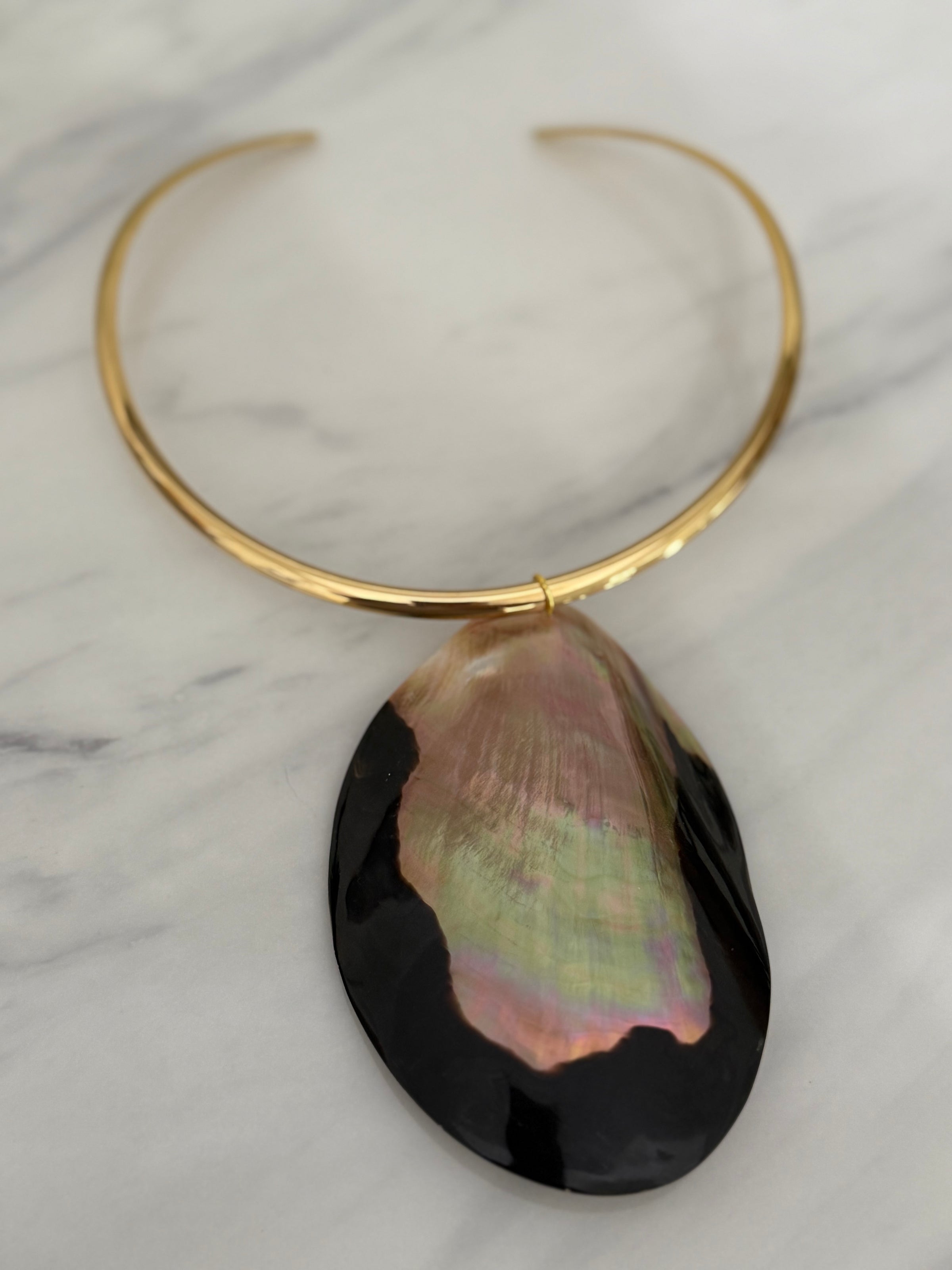 An XL size brown lip mother of pearl shell necklace- this is a very large lacquered shell- so please note this is a statement piece, and may not look right on very petite frames!