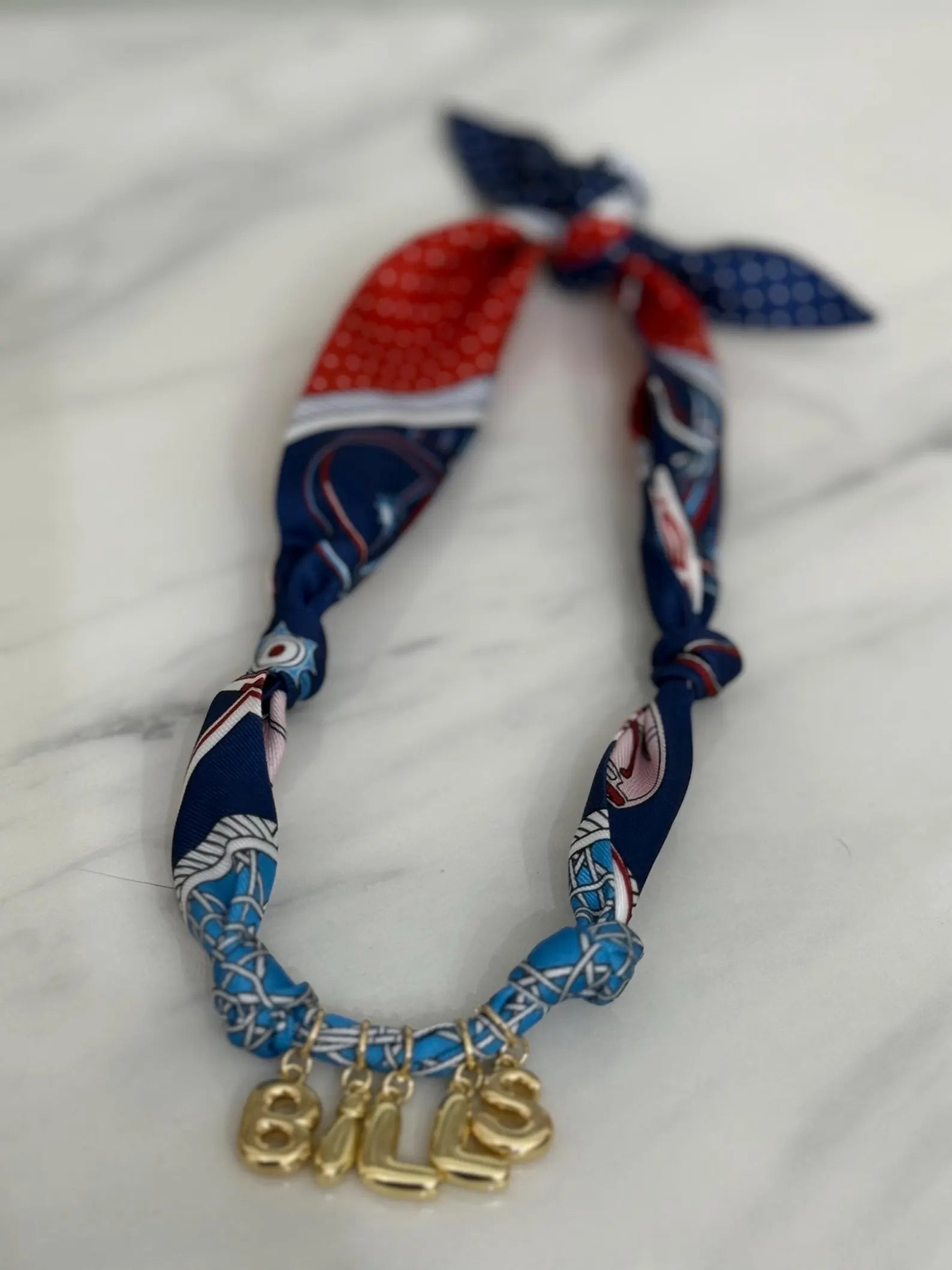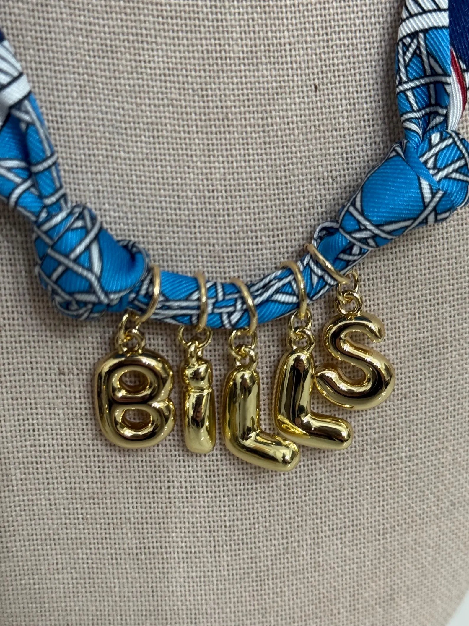 Celebrate your favorite team- a red/white/blue scarf necklace with gold bubble letter charms spelling out BILLS