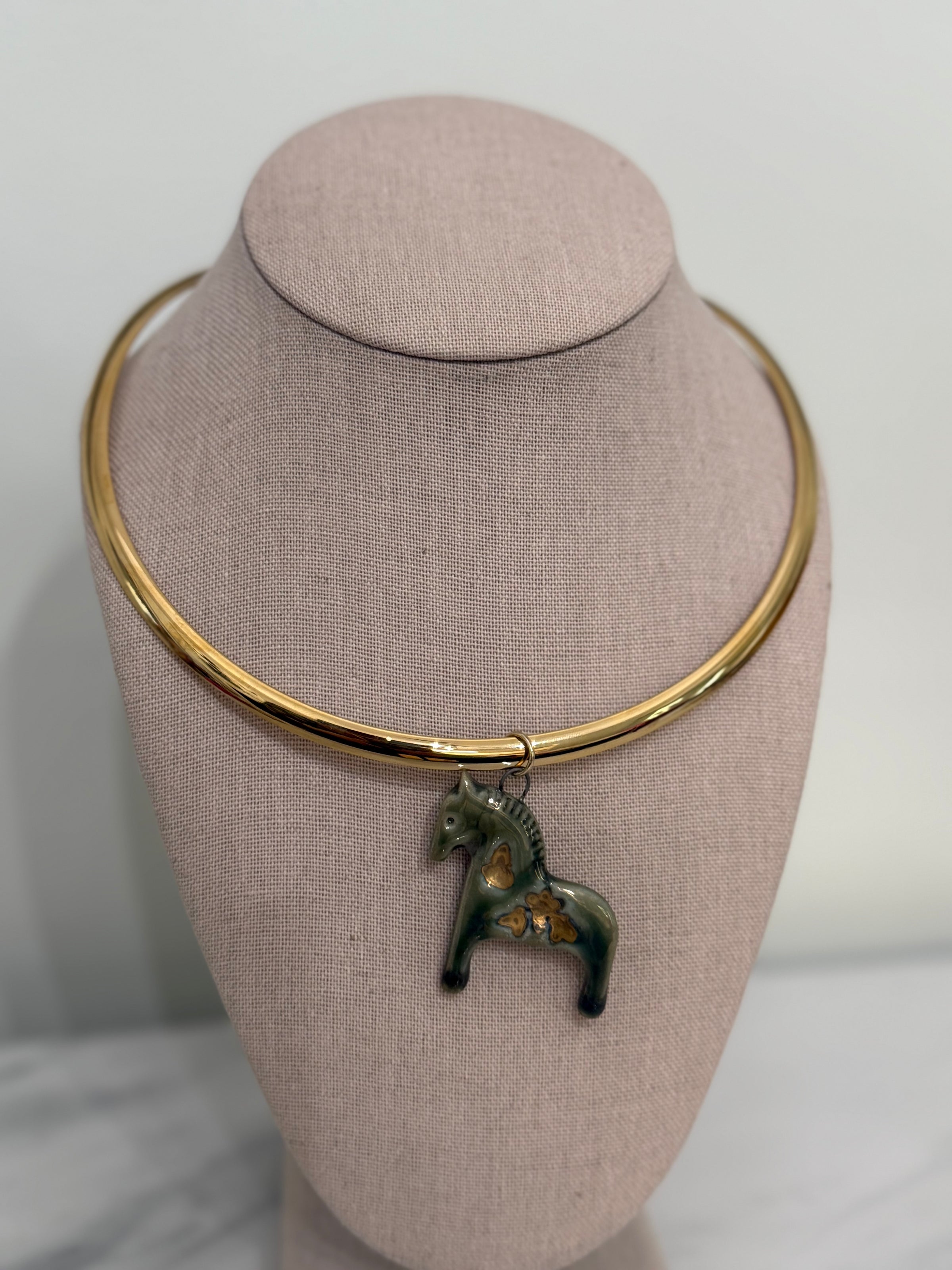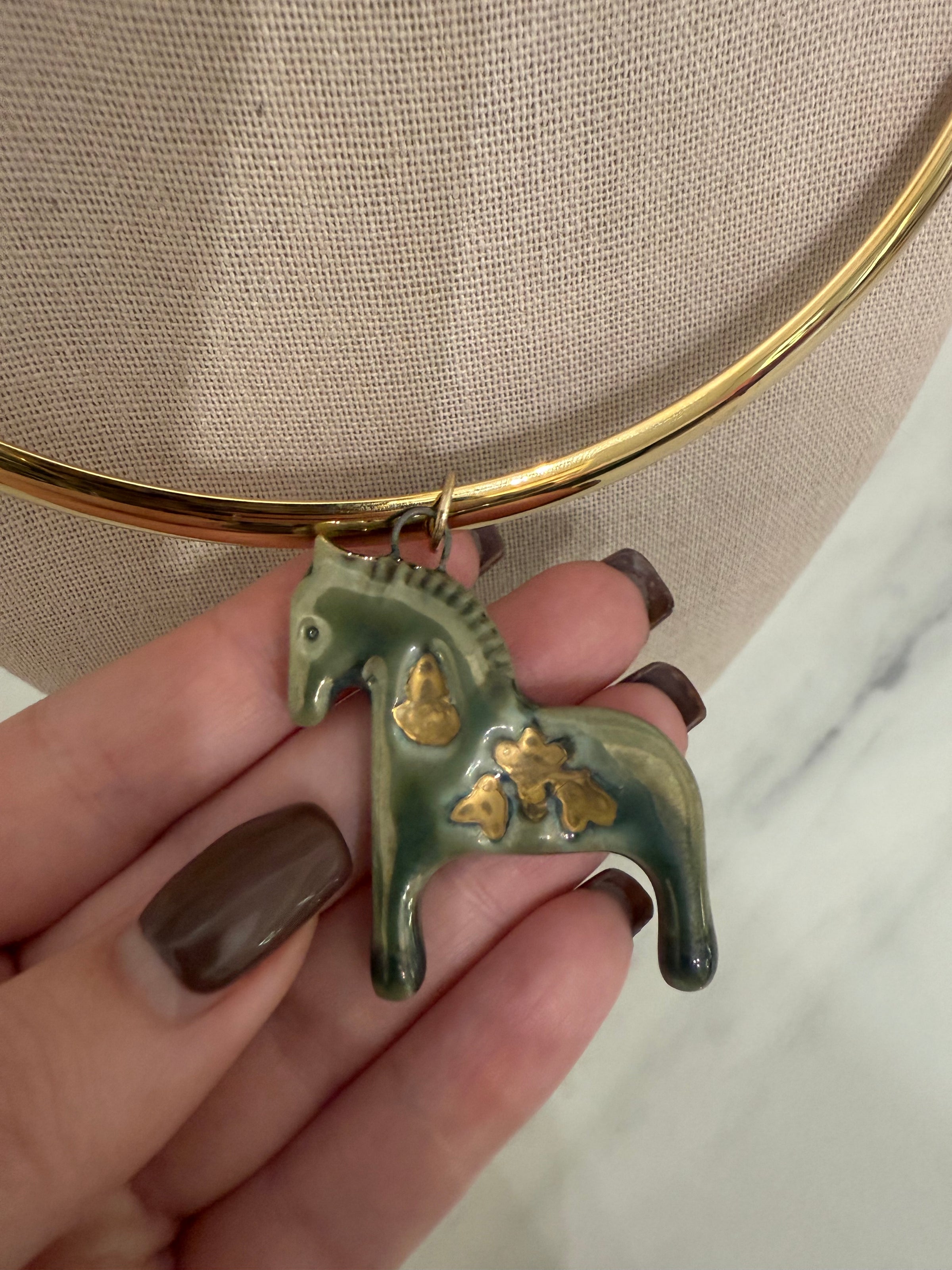 A stunning yet simple collar necklace- a one of a kind teal ceramic horse pendant crafted by Canadian artist Bita Khoshroo on a gold plated collar choker necklace.